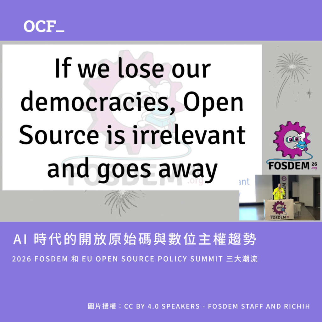 為什麼 AI 時代,關注開源的大家要討論「主權」呢?今年 FOSDEM 從主議程各 Devroom 及周邊活動,也都圍繞這個字展開。FOSDEM 2026 開場時,RichiH 指出:「之所以要討論主權,是因為一旦民主制度消失,開放原始碼的生態系也將難以維持。」這則電子報,OCF 要和你聊聊我們看到的趨勢、與我們後續的行動。